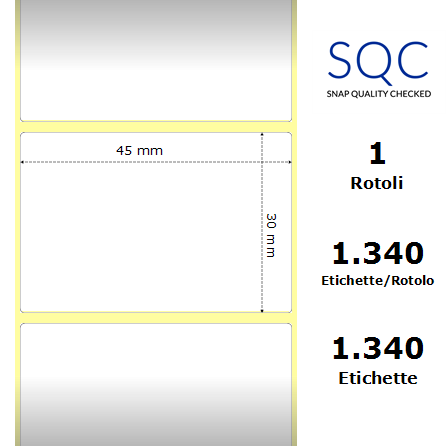 Etichette SQC a bobina. 1 bobina per confezione. 1340 etichette per bobina. Etichette in carta termica protetta con adesivo permanente. Diametro interno: 40 mm. Diametro esterno: 98 mm.