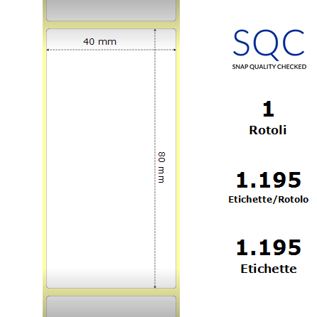 Etichette SQC S-HARD-PD Carta 40 mm x 80 mm Etichette SQC a bobina. 1 bobina per confezione. 1195 etichette per bobina. Etichette in carta con adesivo permanente. Diametro interno: 40 mm. Diametro esterno: 146 mm. Tipo: Supporto di stampa Confezionamento: Bobina Pezzi per confezione: 1 Etichette per pezzo: 1195 Materiale principale: Carta Adesivo: Adesivo permanente Larghezza: 40 mm Altezza\Lunghezza: 80 mm Diametro Interno: 40 mm Diametro Esterno: 146 mm Tecnologia di stampa: Termica diretta Tipologia stampante: Stampanti Industriali Applicazione: Etichettatura di breve durata, Etichettatura non soggetta a luce e calore, Etichettatura vendita al dettaglio, Identificazione prodotti Colore: Bianco Piste: 1 Tacca nera: No